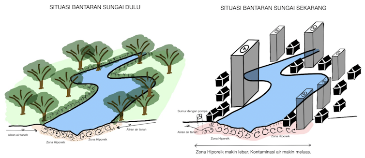 Namun, kondisi itu tidak selamanya terjadi. Saya bersama tim membandingkan kualitas air tanah dan air sungai di bantaran Sungai Cikapundung, Kota Bandung. Hasilnya, kualitas air tanah – terutama yang berada di bantaran sungai – kian mirip dengan air sungai di daerah perkotaan.