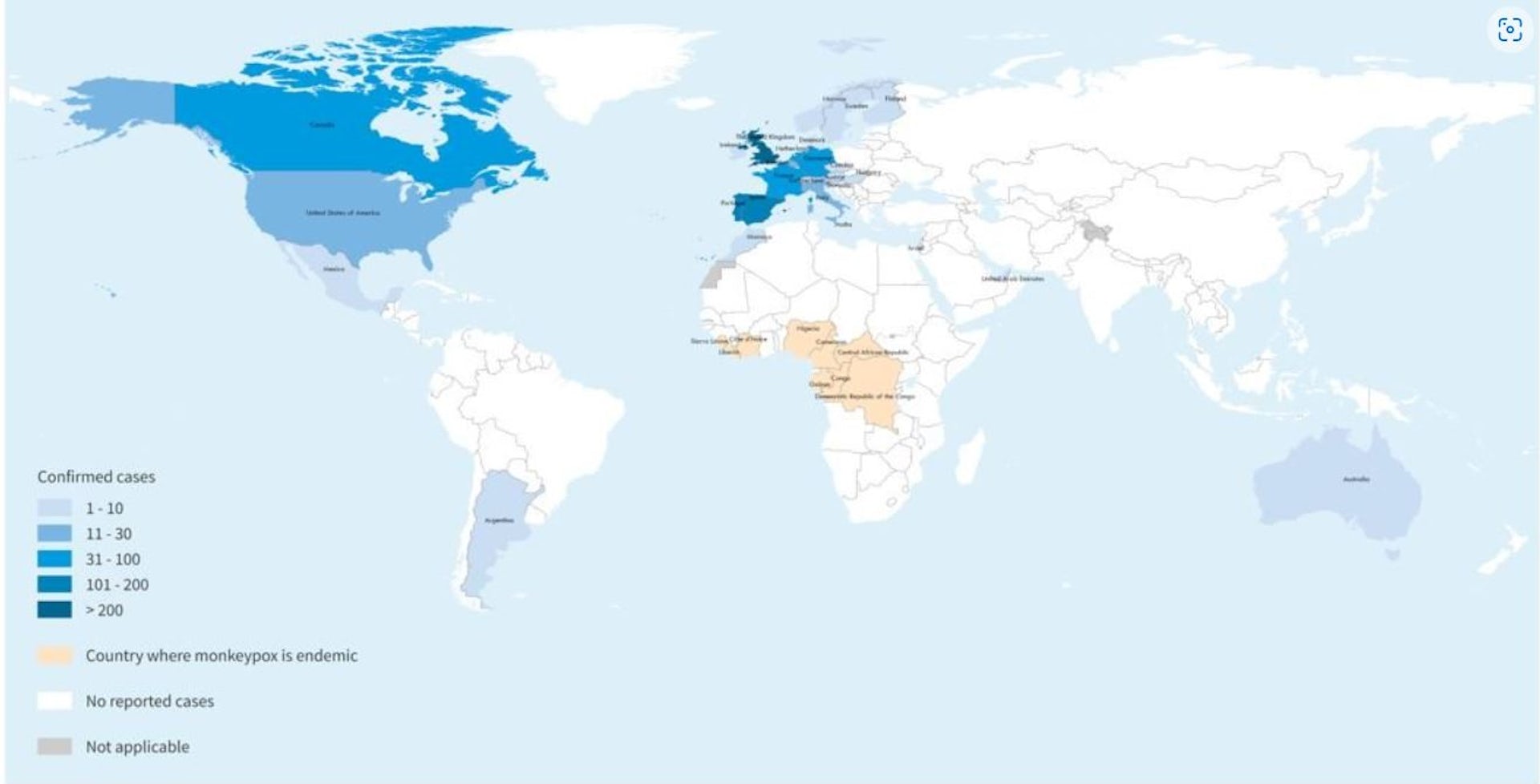 Adapun negara-negara endemik cacar monyet adalah Benin, Kamerun, Republik Afrika Tengah, Republik Demokratik Kongo, Gabon, Ghana (hanya diidentifikasi pada hewan), Pantai Gading, Liberia, Nigeria, Republik Kongo, Sierra Leone, dan Sudan Selatan. WHO melaporkan sejak 1 Januari 2022 hingga 1 Juni 2022 ada sekitar 1.400 kasus terduga cacar monyet, terkonfirmasi 44 kasus, dan kematian 66 kasus di 7 negara endemik di Afrika.